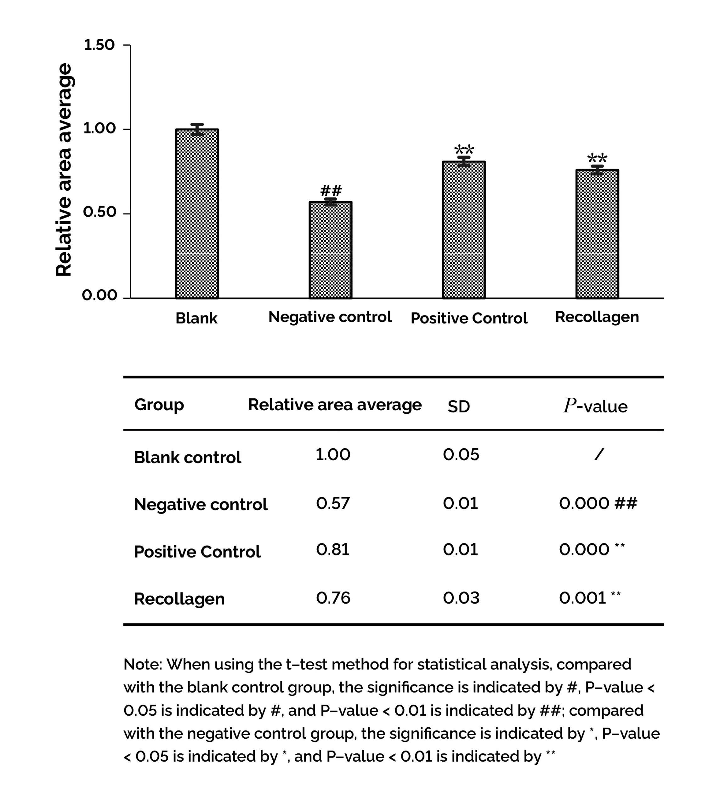 1. Compared with the blank control group, the collagen fiber content in the negative control group was significantly reduced, indicating that the stimulation conditions of this experiment were effective.